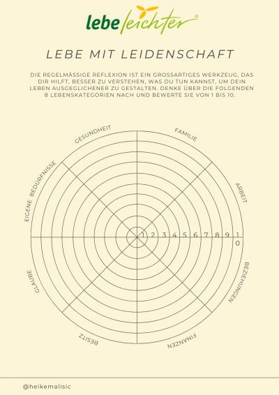 Dafür nutze ich die acht Lebensbereiche aus dem Lebe-leichter-Konzept und eine Skala von 1 bis 10 (1 = sehr schwierig, 10 = sehr stimmig). Du kannst dir das PDF runterladen und selber ausfüllen ;-)